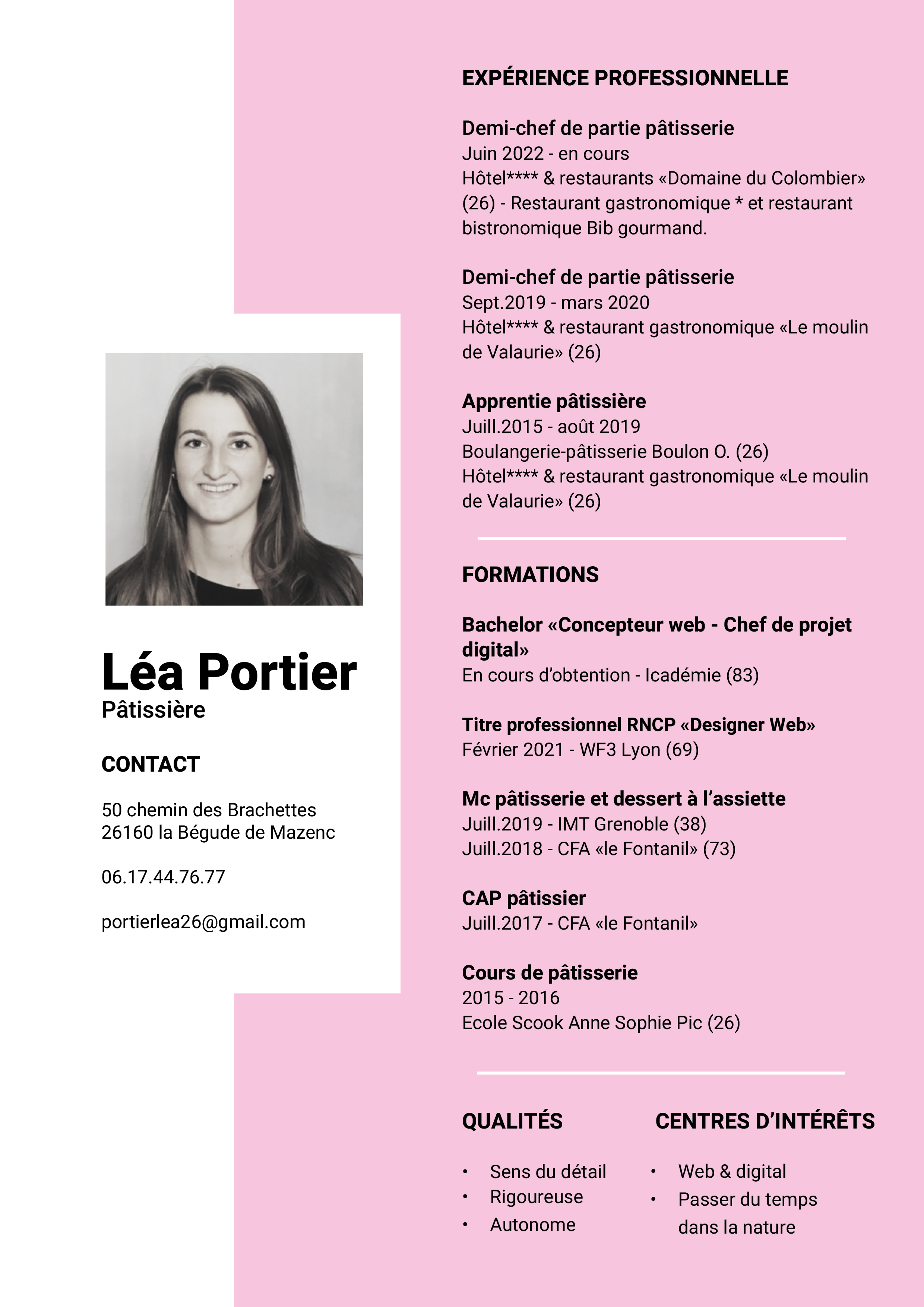 Pâtissière depuis 2015, je suis passionnée par la gastronomie et la photographie. Après avoir réalisé mes études de pâtisserie et fort de mes 4 ans d'expérience, je suis alors devenue Demi-chef de partie Pâtisserie dans un restaurant gastronomique de la Drôme puis de nouveau chef de partie dans un restaurant gastronomique récompensé d'une étoile au guide Michelin.
